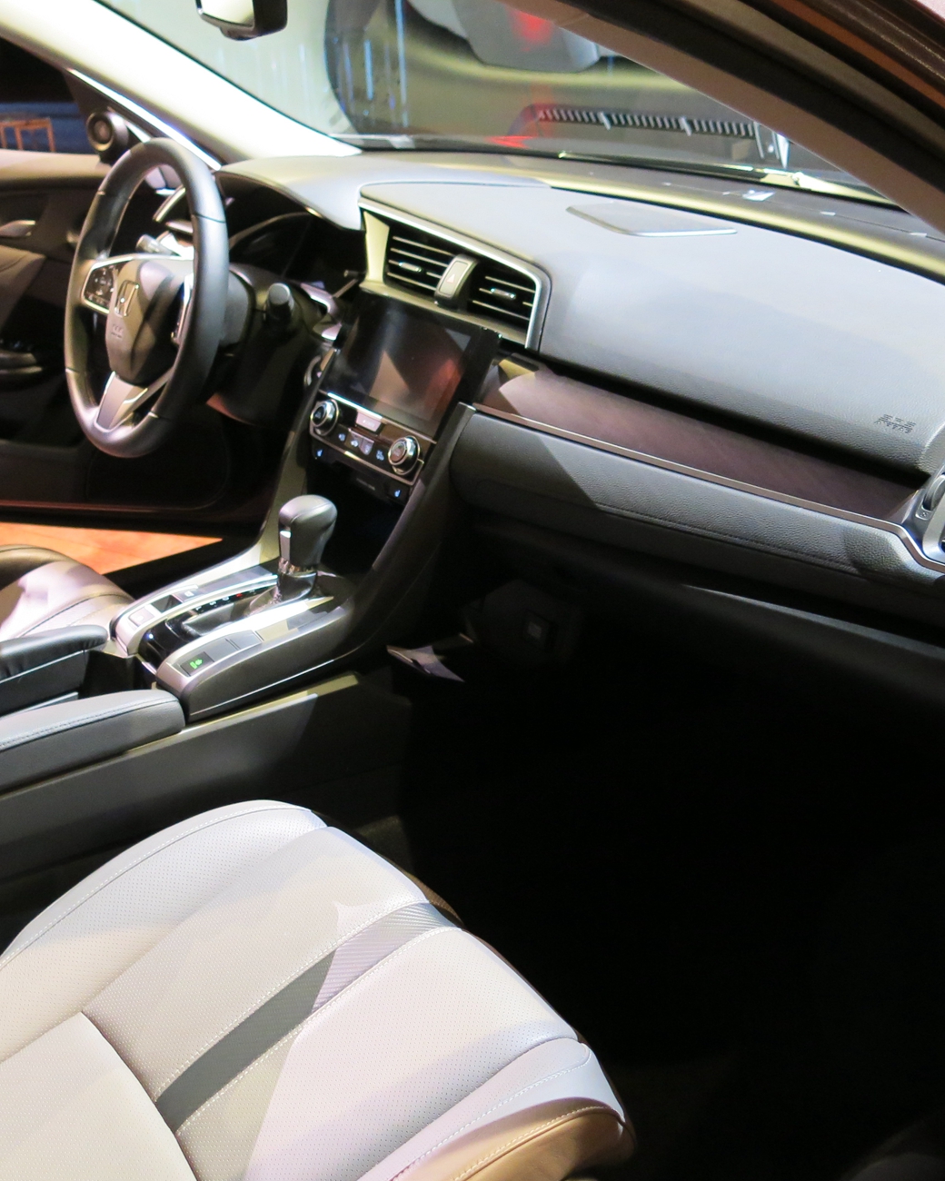 Civic uses the latest version of the company’s so-called ACE (Advanced Compatibility Engineering) body structure that is claimed to be 26% stiffer in torsion than the previous car and incorporates 12% ultra-high-strength steel. Attention was paid during early layout to returning to the classic Honda low-cowl driving position. To achieve this, the driver’s H-point was lowered by 20 mm (0.8 in) to bring it to the same level as Audi’s TT. Height of the floorpan, instrument panel, and engine mounts were commensurately reduced. Cabin volume is increased by a claimed 3.7 ft3 (105 L), with 2 in (51 mm) more rear legroom. Trunk space is 2.6 ft3 (74 L) larger than that of the 2015 model.