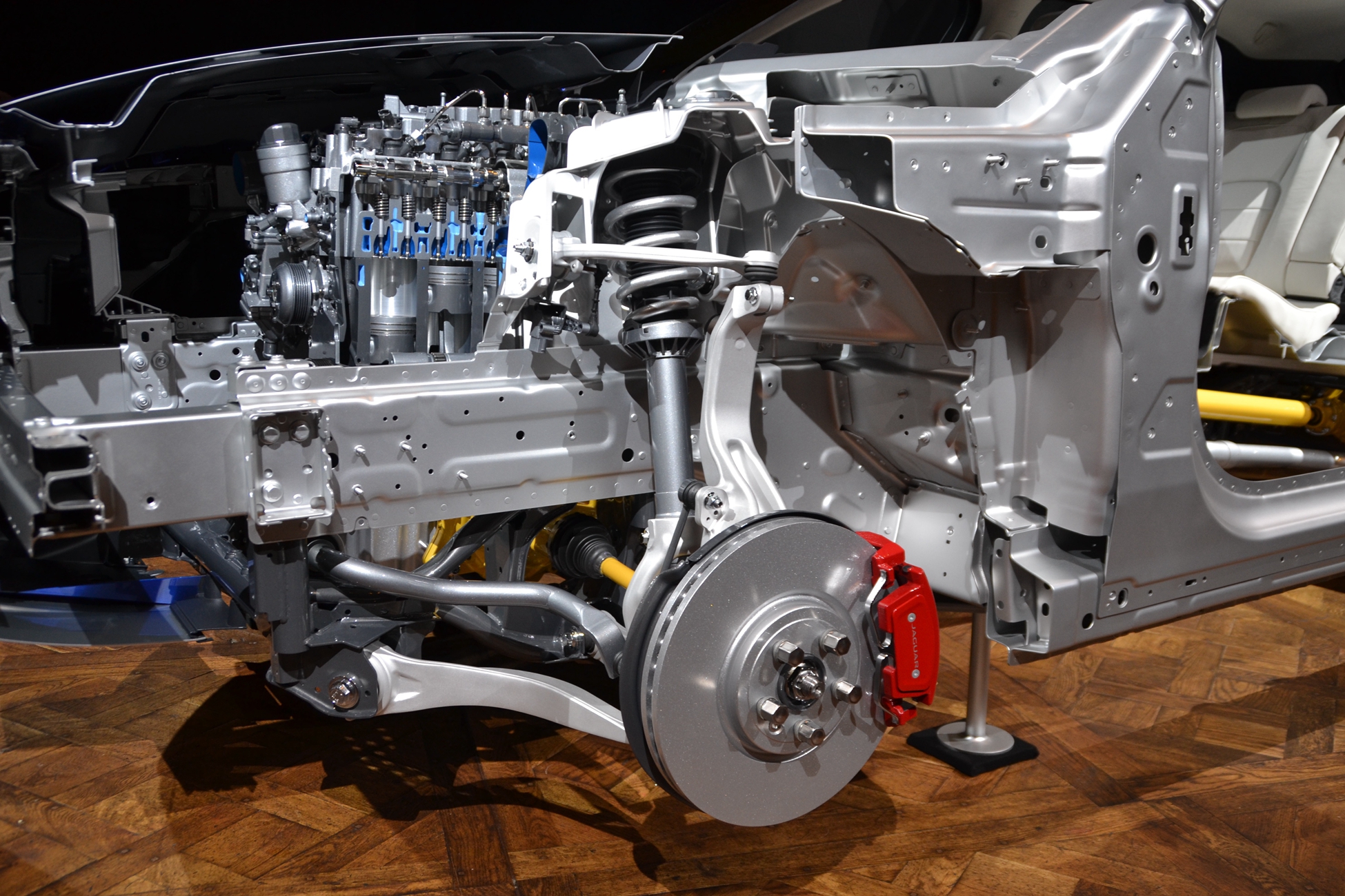 The company shies from the term "platform" with its implicit parts sharing because the F-Pace is 81% unique from its sedan siblings. The result is a vehicle that is 80% aluminum by weight, which is more than any other crossover SUV, said Kevin Stride, Jaguar XE Vehicle Line Director. Areas that are normally high-strength steel for its strength in crashes are high-strength aluminum in the F-Pace, including the B-pillar and the door-surround stamping. Shock towers are high-pressure die-cast aluminum.