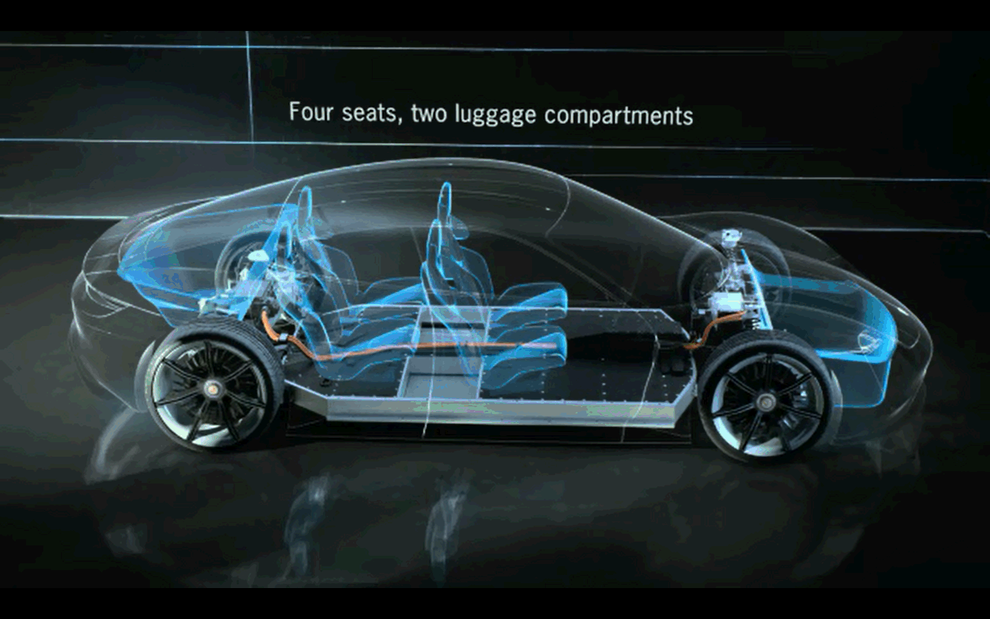Mission E的電池位于車身底板下方兩橋之間的位置,呈縱向放置。前后橋各有一個電機進行驅動。