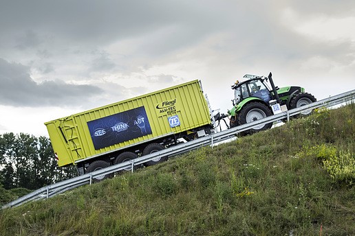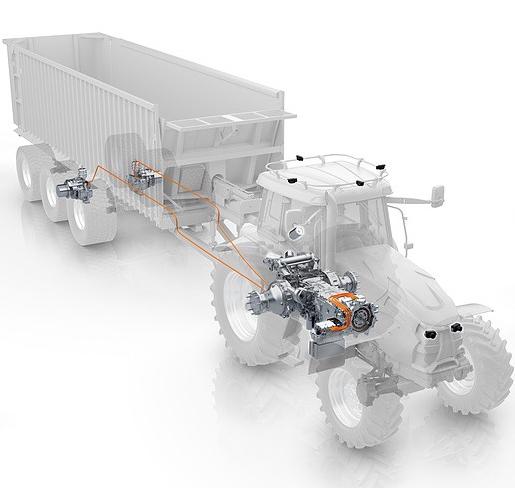 The all-wheel-drive function of the ZF tractor and the electrical-boost function from the single-wheel drive on the trailer combine to deliver optimum traction management. With electrical assistance from the trailer, the tractor can climb uphill gradients of up to 30%, terrain normally off-limits for a conventional tractor/trailer setup, Götz noted. It also helps in difficult conditions in the open field.