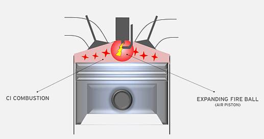 Spark ignition is used to start the engine and under heavy-load conditions, but the switchover to CI is not at any predetermined point. When the right intake-charge boundary conditions are achieved, the expanding fireball in the combustion chamber is created, with SI providing additional compression to the geometric compression ratio of approximately 15-16:1. This reaction induces CI, Hirose explained.