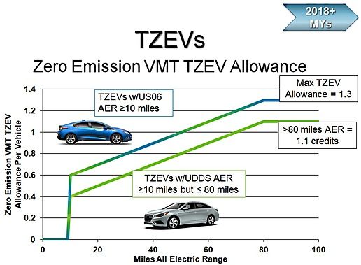 The new rules contrast with the 2009-17 regulations, which put makers with up to 60,000 California sales in the intermediate category, allowed them to meet ZEV requirements with PZEVs, and set large manufacturers with a rising ZEV scale that hit 14% for the 2015-17 period. However, only 3.0% had to be actual ZEV (3000 credits on California sales of 100,000, or 750 vehicles with a credit rating of 4.0).