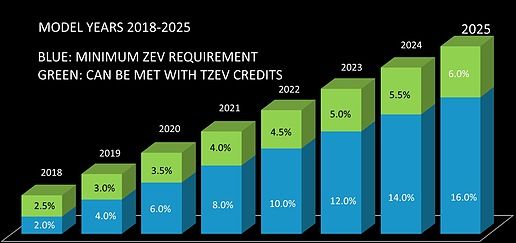The 2018 mandate specifies a large OEM deposit ZEV credits equal to 4.5% of its sales in 2018, although 2.5 of the 4.5 (55%) can be met with TZEV credits. The total requirement rises by 2.5 percentage points per year, with the TZEV number increasing by 0.5. Intermediate-size makers can fulfill all ZEV requirements with TZEV credits, an obviously helpful break.