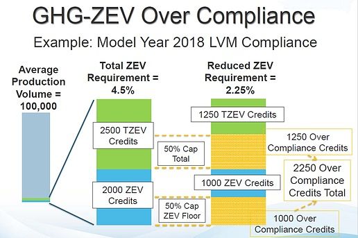 PZEVs and AT PZEVs credits ended completely in 2017, but leftovers can be “banked” for 2018-on use. However, they’re deeply “devalued,” to 25% for intermediate-size OEMs, to just 6.75% for large makers.