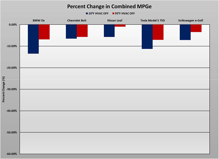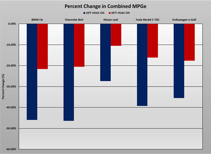“We found that the impact of temperature on EVs is significantly more than we expected,” said Greg Brannon, AAA’s director of automotive engineering. “It’s something all automakers are going to have to deal with as they push for further EV deployment because it’s something that could surprise consumers.” The organization tested five separate models: the BMW i3, the Chevrolet Bolt EV, the Nissan Leaf, the Tesla Model S and the Volkswagen e-Golf. AAA engineers subjecting each car to both 20-degree F cold and 95-degree F heat.