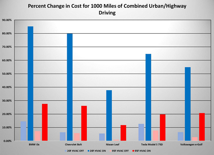 這些數(shù)字還不能完全反映潛在的續(xù)航里程損失,這里還沒有考慮在冬季通勤時(shí)還會打開座椅或者方向盤加熱或是打開前照燈的情況,駕駛者可以切實(shí)體會到這些影響,此外不僅僅是續(xù)航里程減少他們會還支出更多的費(fèi)用。根據(jù)AAA估計(jì),一位典型的美國純電動(dòng)汽車車主每1,000英里(1,600公里)可能需要多支出24.27美元(約合165元人民幣)。該研究團(tuán)隊(duì)同樣還進(jìn)行了在極熱天氣下的實(shí)驗(yàn)測試,當(dāng)氣溫達(dá)到95°F(35°C),如果駕駛員愿意忍受酷暑,那么續(xù)航里程僅下降4%,但是一旦開啟空調(diào)將直線下降17%。