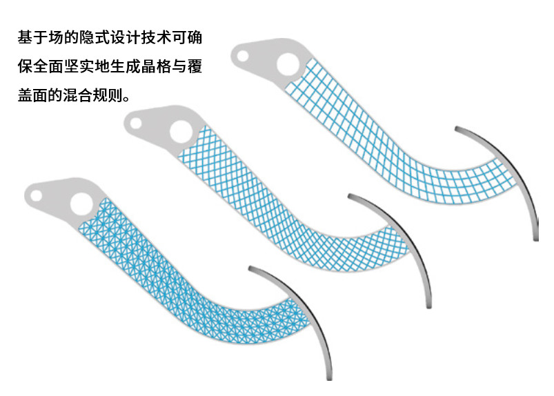 增材制造晶格結(jié)構(gòu)的通病在于晶格和覆蓋面容易剝離的問(wèn)題。對(duì)此,我們可以專(zhuān)門(mén)創(chuàng)建一套規(guī)則,將晶格平滑地混合至表層(第三步)。如今,憑借隱式建模開(kāi)發(fā)框架中的距離場(chǎng),設(shè)計(jì)人員可以輕松將這種改動(dòng)應(yīng)用至全局,而無(wú)需再像傳統(tǒng)工具時(shí)代那樣,逐條手動(dòng)選擇模型中的每條邊,而幾何形狀的改動(dòng)則意味著必須花費(fèi)數(shù)小時(shí)重復(fù)這些枯燥的工作。