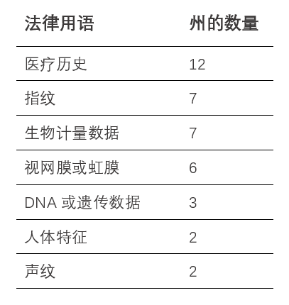 目前,全美共有十六個(gè)州已將生物特征數(shù)據(jù)納入普通數(shù)據(jù)隱私法的保護(hù)范圍,具體受到保護(hù)的生物特征種類包括: