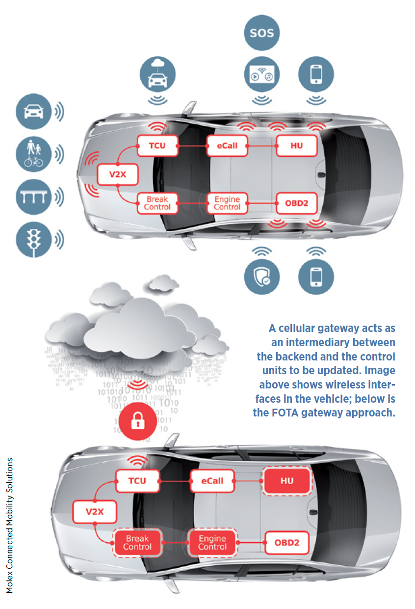許多設備都可以使用 FOTA 方法進行更新。廠商的后端和車輛中需要更新的設備之間存在一種媒介,即一個配備有移動網(wǎng)絡接口的控制單元,也就是蜂窩網(wǎng)關。該網(wǎng)關可以通過 OTA 接口接收所有軟件包,并通過 CAN 總線系統(tǒng)或以太網(wǎng)等高性能通信通道將軟件包分發(fā)到各目標設備。作為主設備,蜂窩網(wǎng)關還將同時監(jiān)視和協(xié)調(diào)整個更新過程。