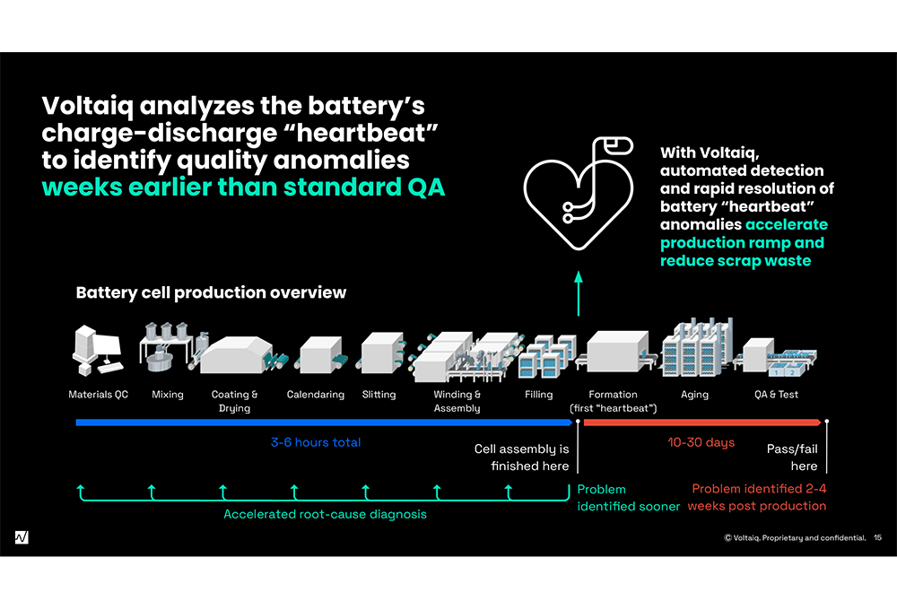 Voltaiq advocates constantly monitoring data during the manufacturing process so problems can be addressed quickly before they result in delays or monetary losses. Sholklapper said that some of today’s battery factories even gather data by plugging thumb drives into machines at each step in manufacturing before collecting it in one place for analysis. Part of Voltaiq’s work is helping clients gather that data in real-time.
